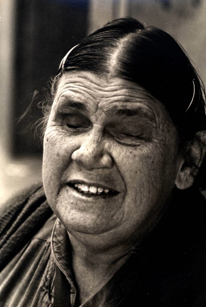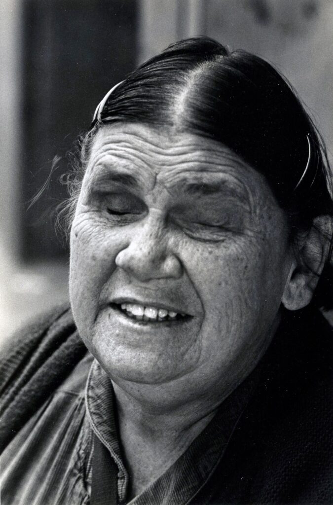 Smiling elderly woman with closed eyes.