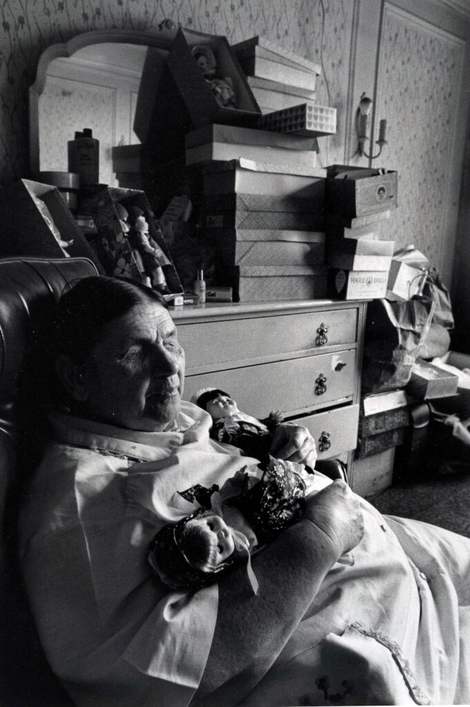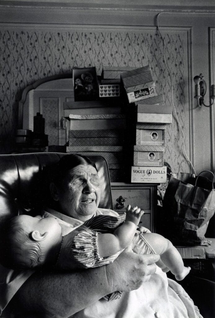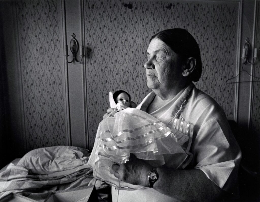 Elderly woman holding a doll, looking contemplative.
