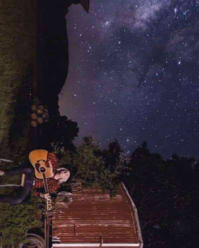 Person playing guitar under starry night sky.