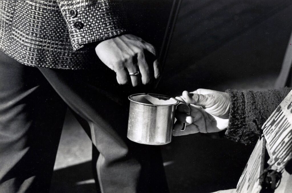 Person holding cup towards passerby in street.