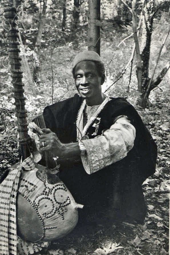 Man playing traditional African string instrument outdoors.