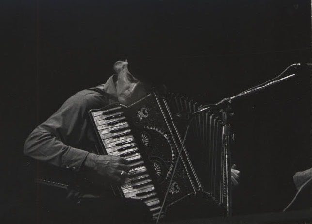 Musician playing accordion on dark stage.