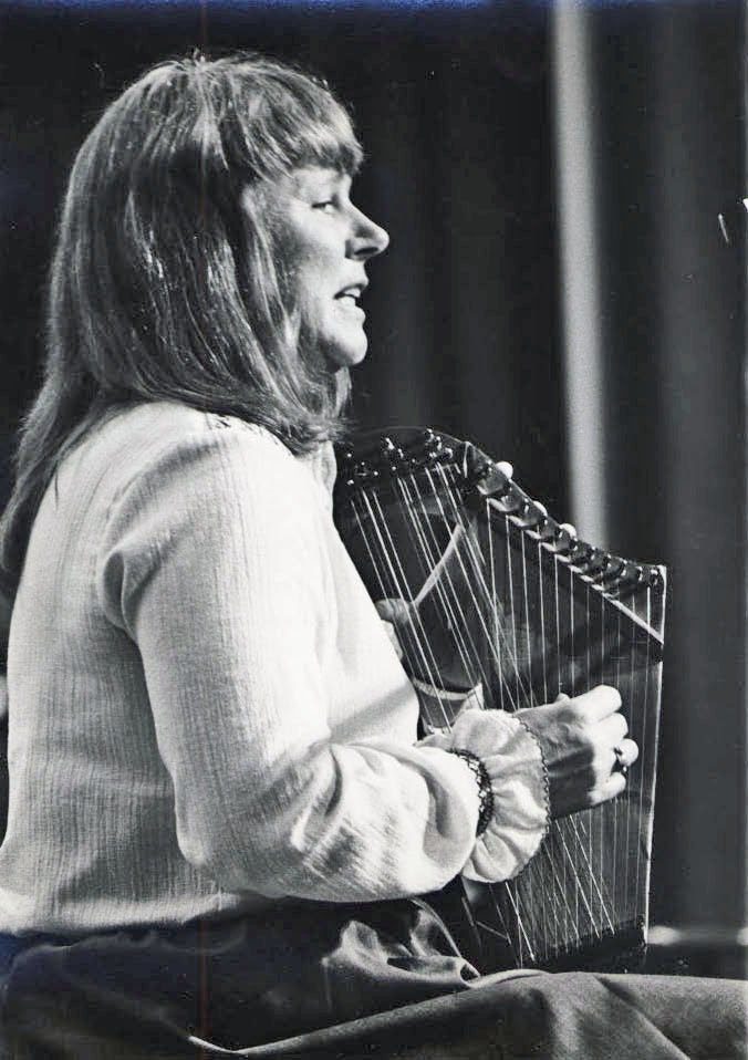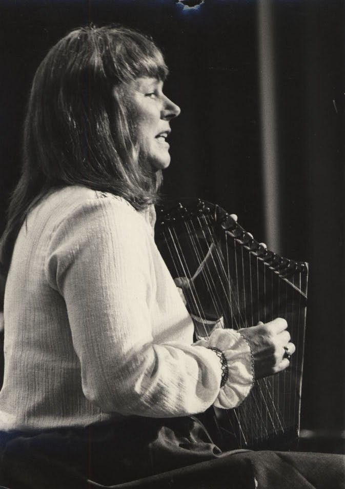 Woman playing autoharp in profile view.