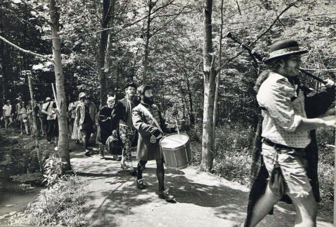 Parade of people in costumes through forest.