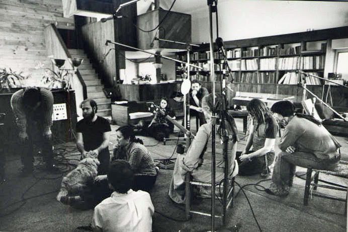 People gathered in a recording studio setting.