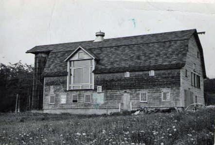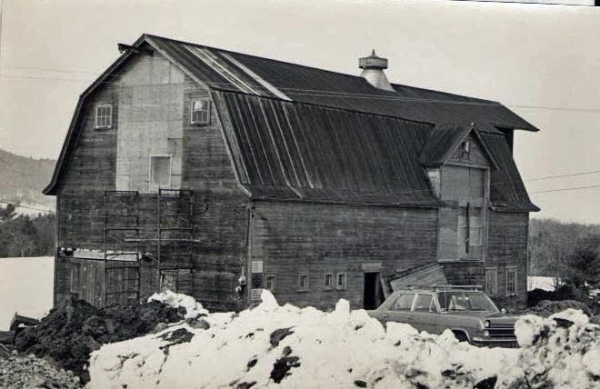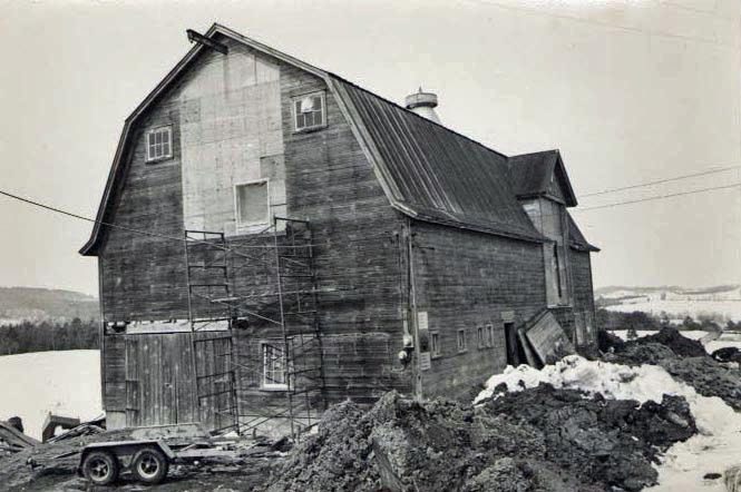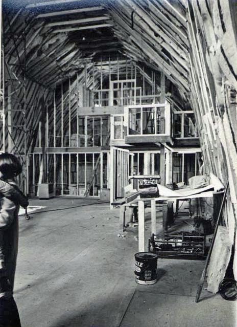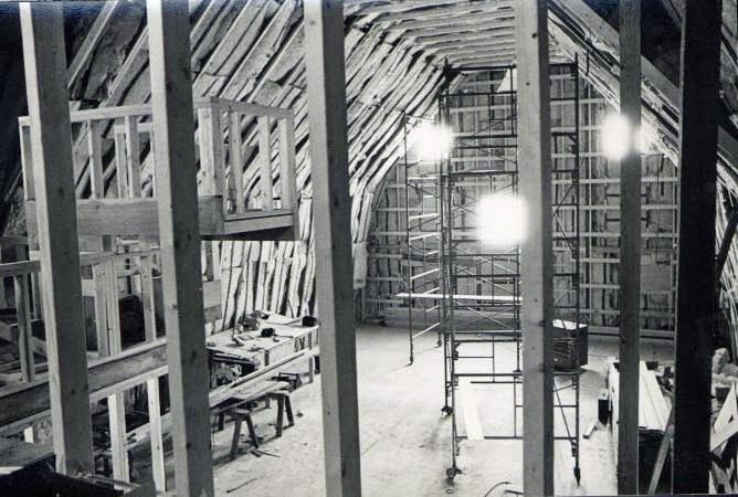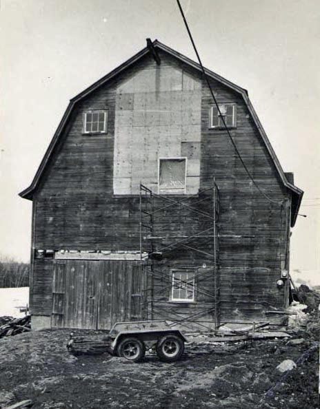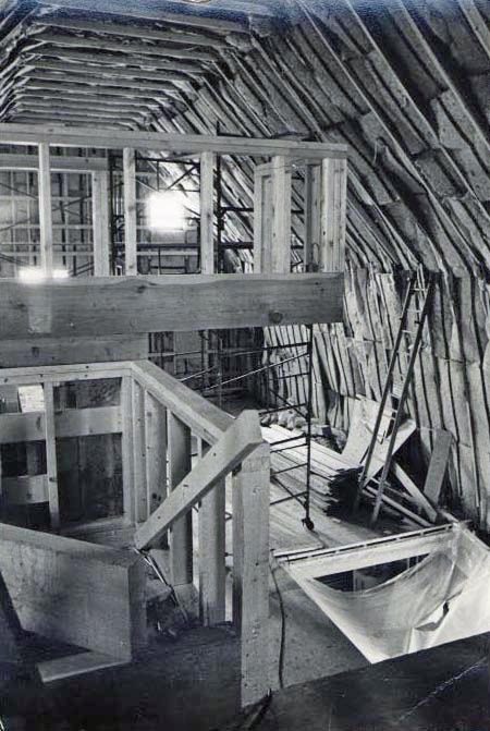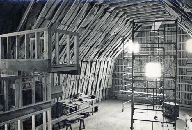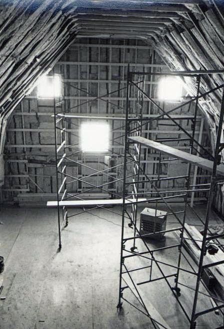 Barn interior under construction with scaffolding.