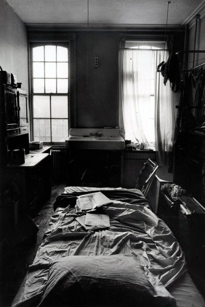 Dimly lit, cluttered room with unmade bed.