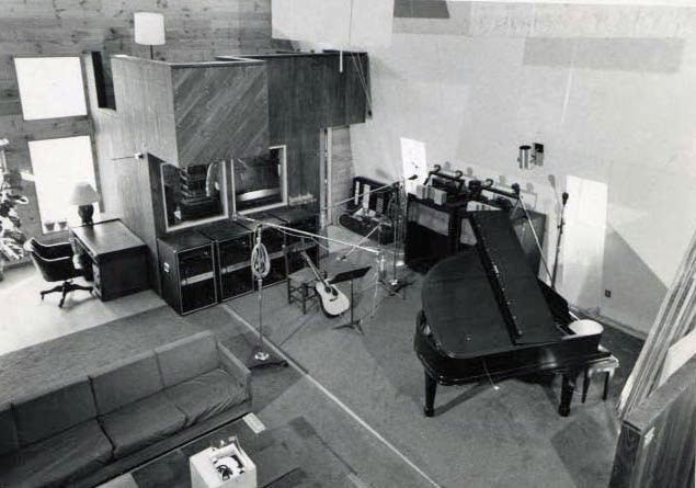 Musicians with instruments in a recording studio.