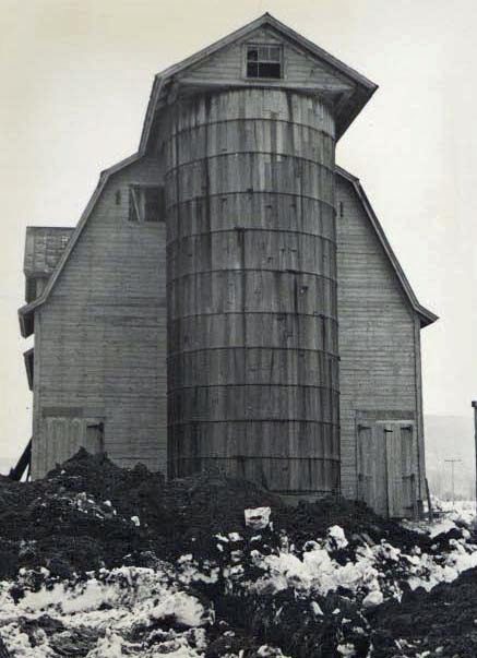 Old barn with a tall wooden silo.