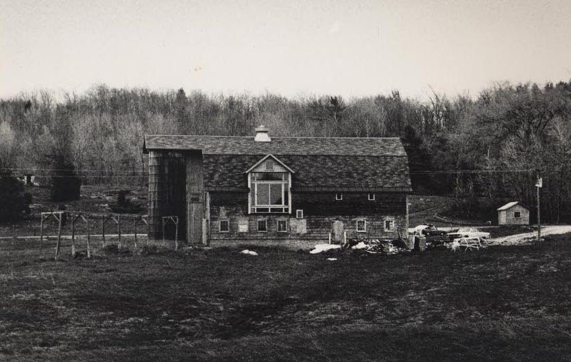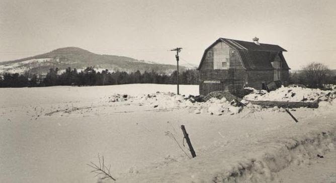 Rural winter landscape with barn and hill.