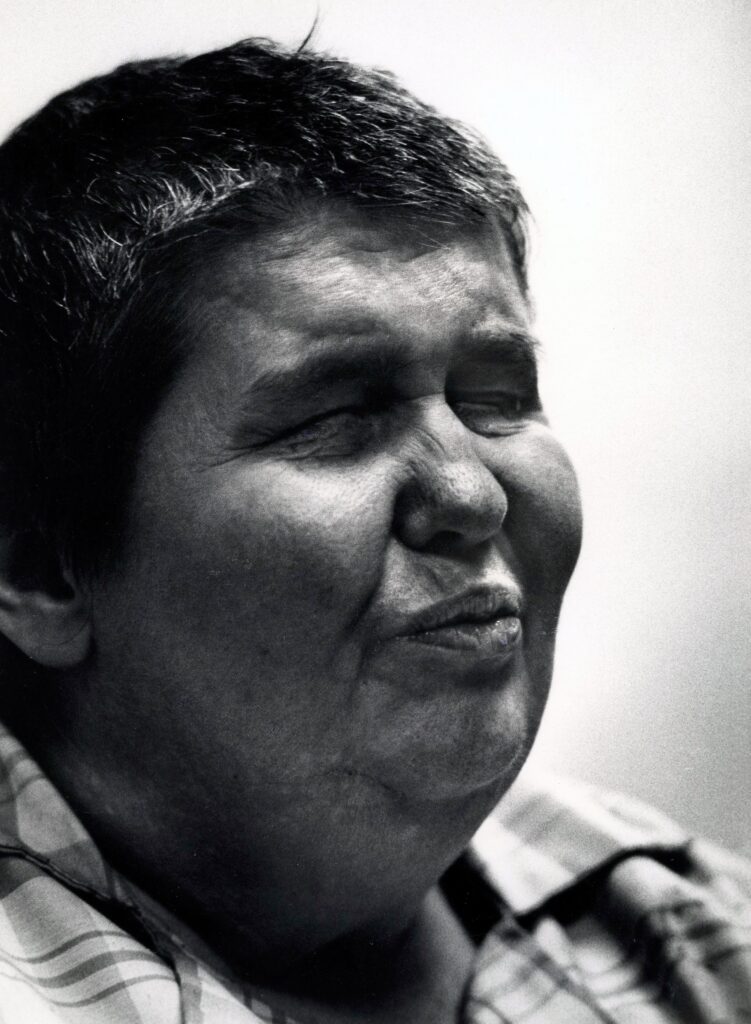 Smiling elderly woman with eyes closed.