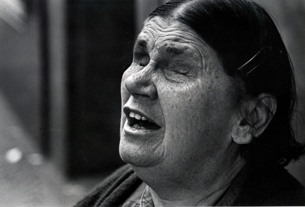 Elderly woman with eyes closed, singing passionately.