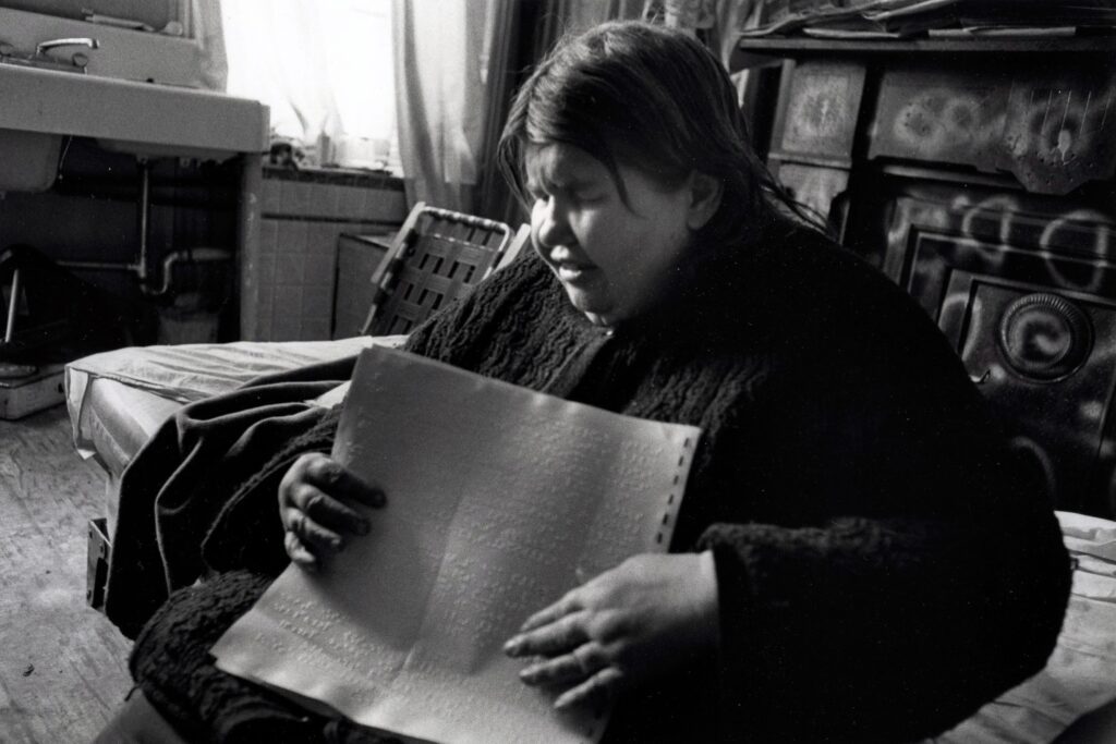 Person reading Braille in dimly lit room.