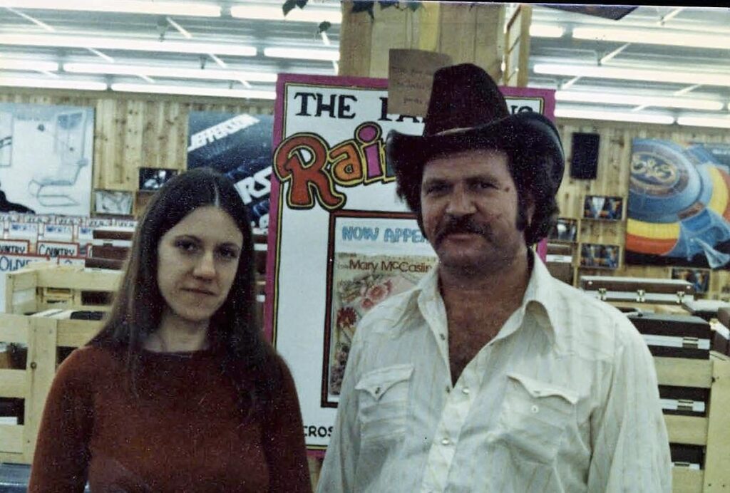Man and woman in store with posters.