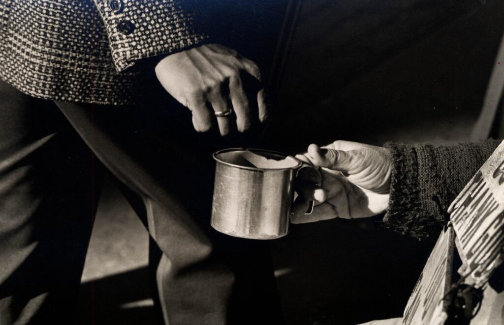 Hands exchanging a metal cup, close-up.
