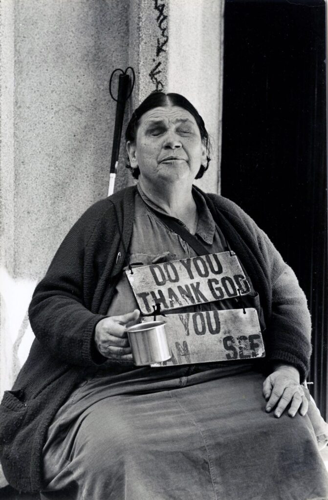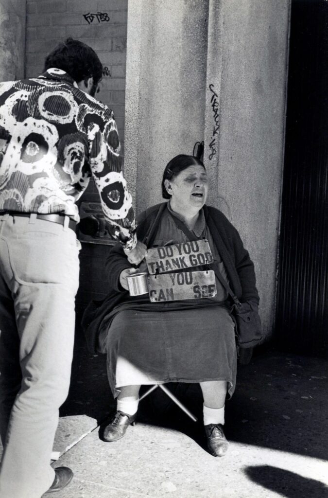 Man giving donation to seated woman outside.
